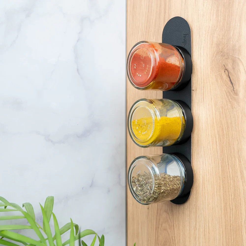 In het deksel van elk glazen potje zit een krachtige magneet geïntegreerd. In combinatie met de meegeleverde metalen strip blijven de potjes stevig op hun plek, waar je ze ook bevestigt: in de keuken, aan een kastwand of onder een plank. Dankzij de perfect gebalanceerde magnetische krachtverhouding blijven de potjes veilig hangen, zelfs ondersteboven, maar kunnen ze toch eenvoudig worden losgenomen wanneer je ze nodig hebt.
