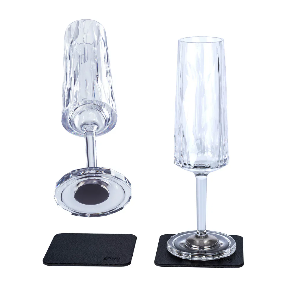 In de bodem van de kunststofglazen is een elegant, met de hand gegoten magneet geïntegreerd.