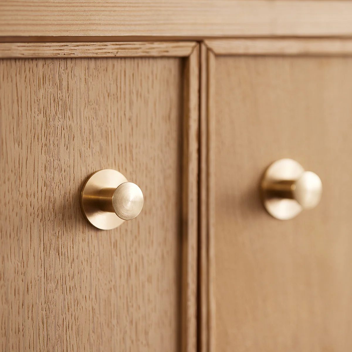 The Moebe knob is both simple and versatile. Constructed with only two pieces of metal and a screw, you can use it in a variety of ways – as a wall hook, door knob, or for kitchen cupboards. Available in both stainless steel and brass.