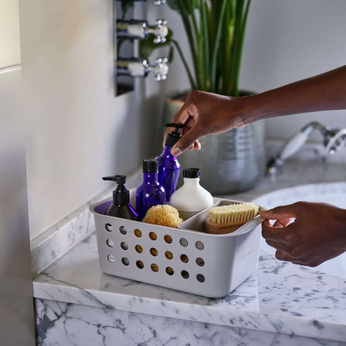 De ultieme opbergoplossing voor je camper: onze veelzijdige opbergmand, perfect voor het netjes houden van al je verzorgingsproducten, van shampoos tot deodorants en haaraccessoires. Met diepe, geventileerde zijkanten voor optimale luchtcirculatie en een handige, verplaatsbare bak voor kleinere items, biedt het de ideale manier om je spullen georganiseerd te houden, zowel op planken als in lades. Bovendien is deze mand gemakkelijk te demonteren voor een snelle schoonmaak. Maak van je camper en vrijetijdsvoertuig een toonbeeld van orde en gemak met deze slimme opbergmand.