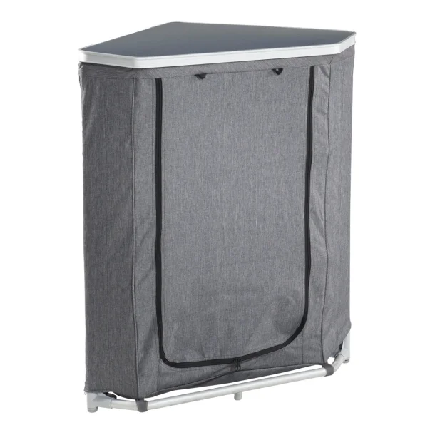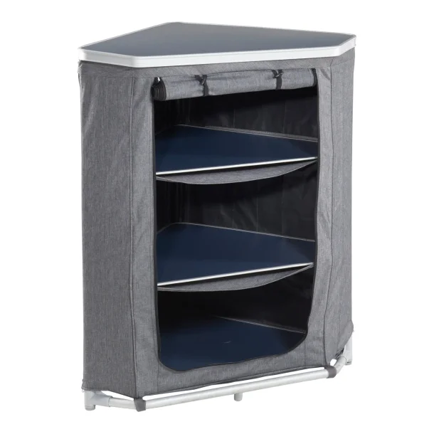Handige hoekopbergkast met drie legplanken en een vast MDF-blad. Compact, stevig en eenvoudig op te zetten. Draagvermogen 30 kg, gewicht 4,5 kg. Afmetingen 89 x 53 x 53 cm, opgevouwen 53 x 53 x 20 cm. Ideaal voor kamperen en kleine ruimtes.