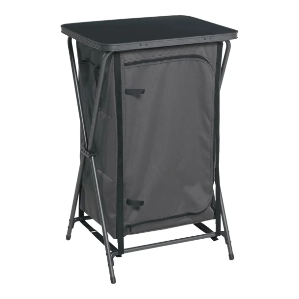 Handige en compacte opvouwbare kast met drie planken en een vaste bovenplaat. Dankzij het unieke vouwsysteem snel op te zetten en in te klappen. Bij opbergen worden de planken verwijderd voor een compact formaat. Met een draagvermogen van 30 kg en een licht gewicht van 5,8 kg is deze kast ideaal voor kamperen en outdoor gebruik. Afmetingen uitgeklapt: 97 x 60 x 62 cm, opgevouwen: 62 x 57 x 13 cm.