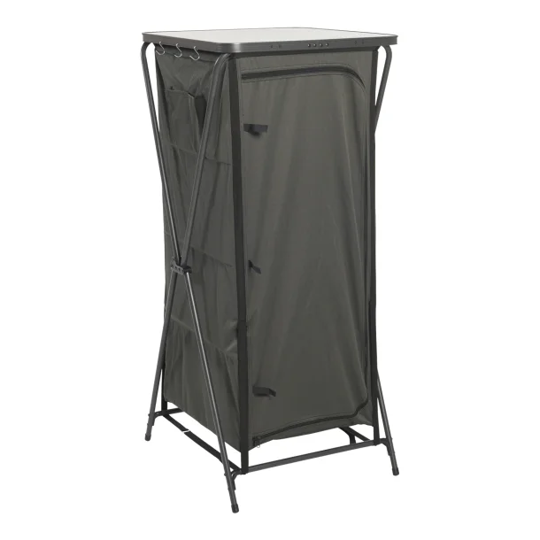 Ruime en praktische opvouwbare kast met vier legplanken en vast bovenblad. Dankzij het unieke vouwsysteem snel op te zetten en in te klappen. Bij opbergen worden de planken verwijderd voor een compact formaat. Draagvermogen 30 kg, gewicht 9,8 kg. Afmetingen uitgeklapt: 140 x 60 x 66 cm, opgevouwen: 66 x 60 x 13 cm. Ideaal voor kamperen en outdoor gebruik