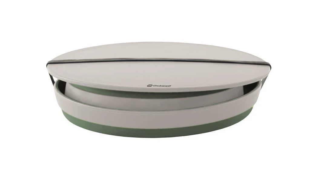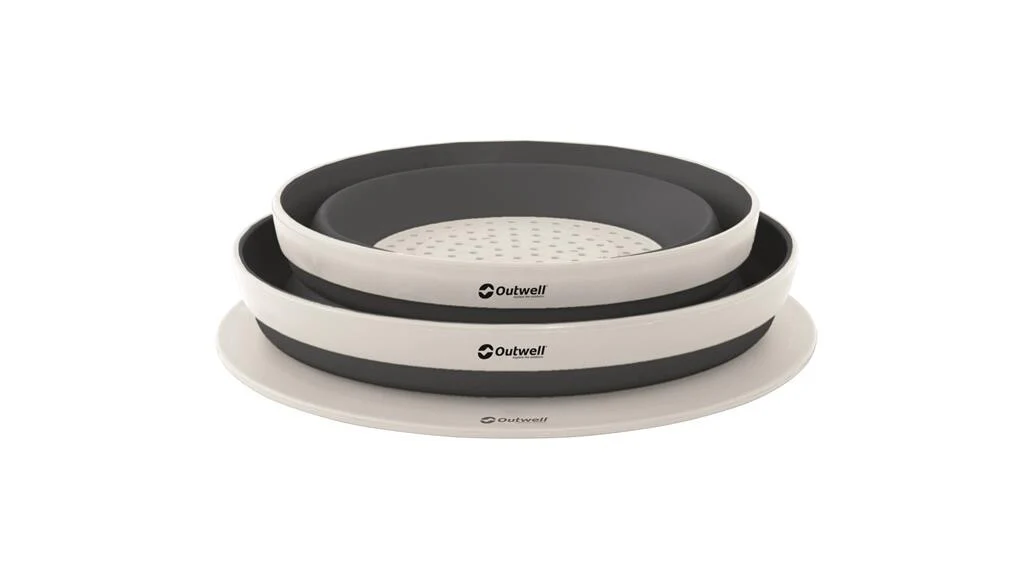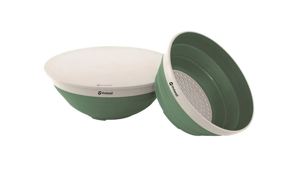 • Indrukbare kom met deksel en vergiet. Passen in mekaar.