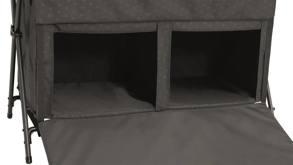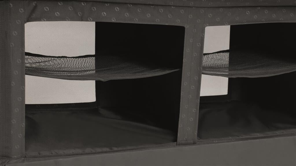 Ruim opbergmeubel met geruisloze toegang via onze klepdeur en handgreep. Magneten zorgen ervoor dat de deur stevig tegen de kast sluit. Binnenin vind je vier vaste planken en twee netplanken, die ruime opbergruimte bieden. Een organiseringsvak en hangende haken aan de zijkant voegen extra functionaliteit toe, terwijl netventilatie zorgt voor goede luchtcirculatie. Het meubel vereist geen montage en kan binnen enkele seconden worden geopend en opgevouwen.