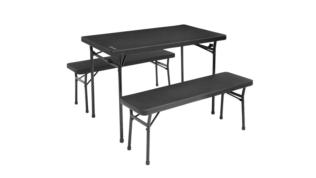 Outwell picknicktafel met waterdicht tafelblad in robuust, voorgevormd kunststof. De banken worden aan het tafelframe bevestigd voor gemakkelijk transport.