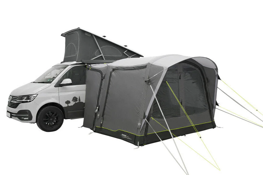 Geniet van beschutting in elk weer met de veelzijdige, opblaasbare Outwell California Highway Air drive-away luifel. Bevestig ze eenvoudig en snel parallel aan je camper, wat de totale breedte op kleine plaatsen vermindert. De brede zij- en voordeuren kunnen opzij worden gerold, zodat je van de natuur kunt genieten vanuit de tent.