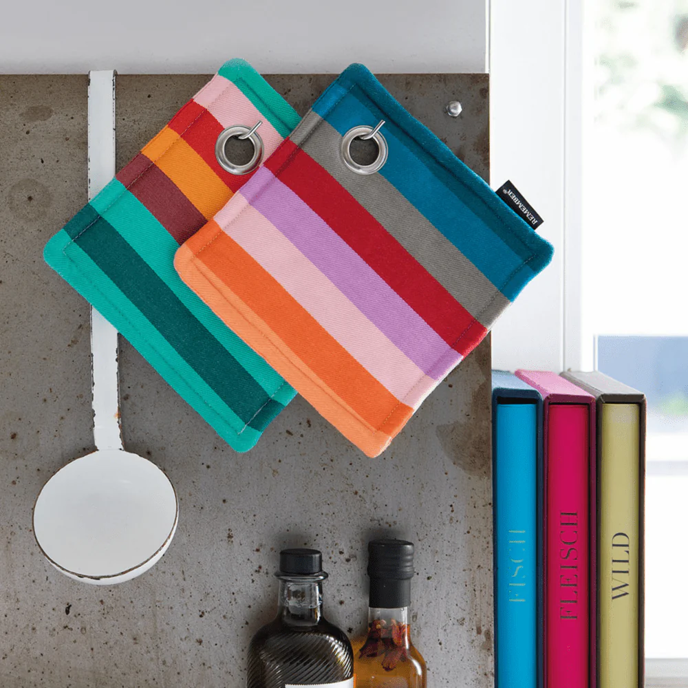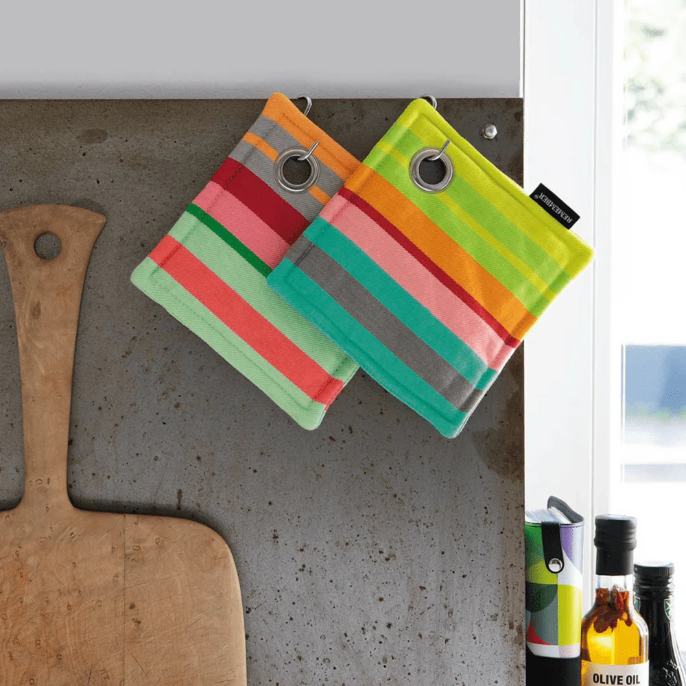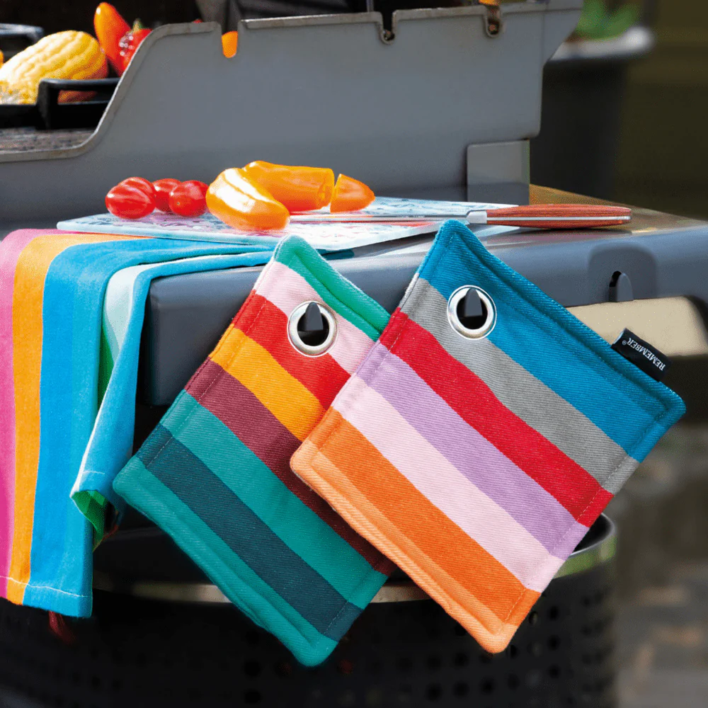 Verrijk je camperkeuken met de Pannenlap Set van Remember, waar stijl en veiligheid hand in hand gaan. Deze set van twee gewatteerde pannenlappen, elk in een uniek en op elkaar afgestemd design, biedt de perfecte mix van functionaliteit en decoratieve flair. Vervaardigd uit duurzaam katoen en versierd met een levendige multicolor print, beschermen deze pannenlappen niet alleen je handen tegen hitte, maar fleuren ze ook je keuken op. Essentieel voor iedereen die van koken houdt, zorgen deze pannenlappen voor een kleurrijk en veilig kookavontuur in elke camper.