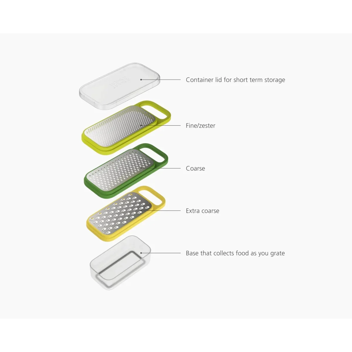 De set bevat drie verschillende raspbladen voor uiteenlopende ingrediënten: een extra grove rasp, een grove rasp en een fijne rasp/zester. Met de handige handgrepen kun je ook rechtstreeks boven een bord of pan raspen.