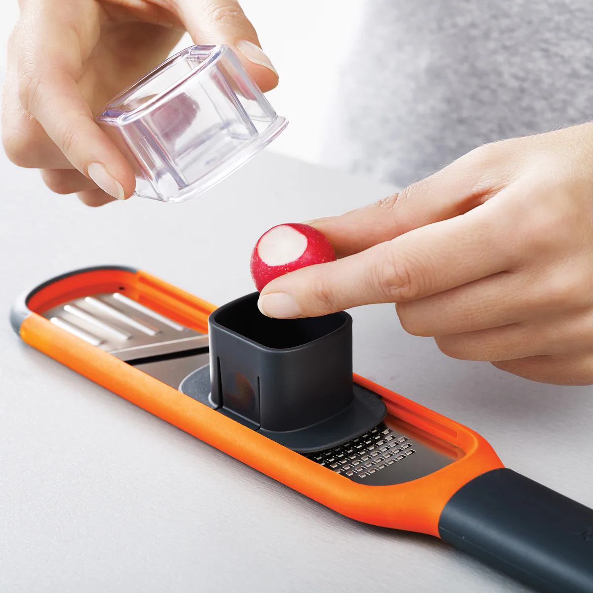 Optimaliseer je camper- of buitenkeuken met de Joseph Joseph rasp en mandoline combinatie, het ultieme gereedschap voor het moeiteloos raspen van kleine voeding zoals gember, look etc. Dankzij de scherpe snijvlakken, het ergonomisch gevormde handvat en de vinger bescherming, biedt deze rasp niet alleen precisie en comfort, maar ook veiligheid bij elk gebruik. Met de plastic beschermhoes berg je de rasp-snijder veilig op. Na gebruik is de rasp eenvoudig schoon te maken, waardoor het een onmisbaar hulpmiddel is voor elke culinaire avonturier.