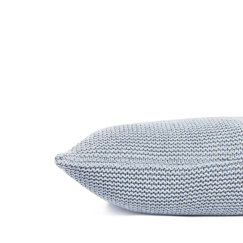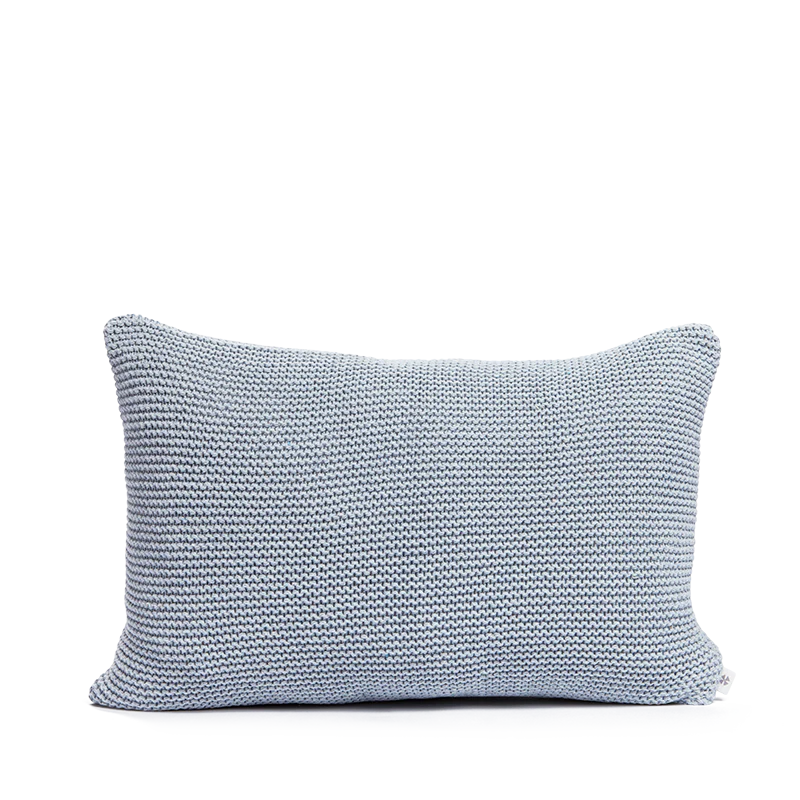 Super soft, knitted cushion made of recycled denim yarn in soft blue. Everyone has their own favourite jeans. What happens when they are worn out? We give denim a second life by removing zips and buttons and spinning the fibres to a soft yarn that we use for our throws. An ecological product, a good alternative for cotton and a great way to dress your home.