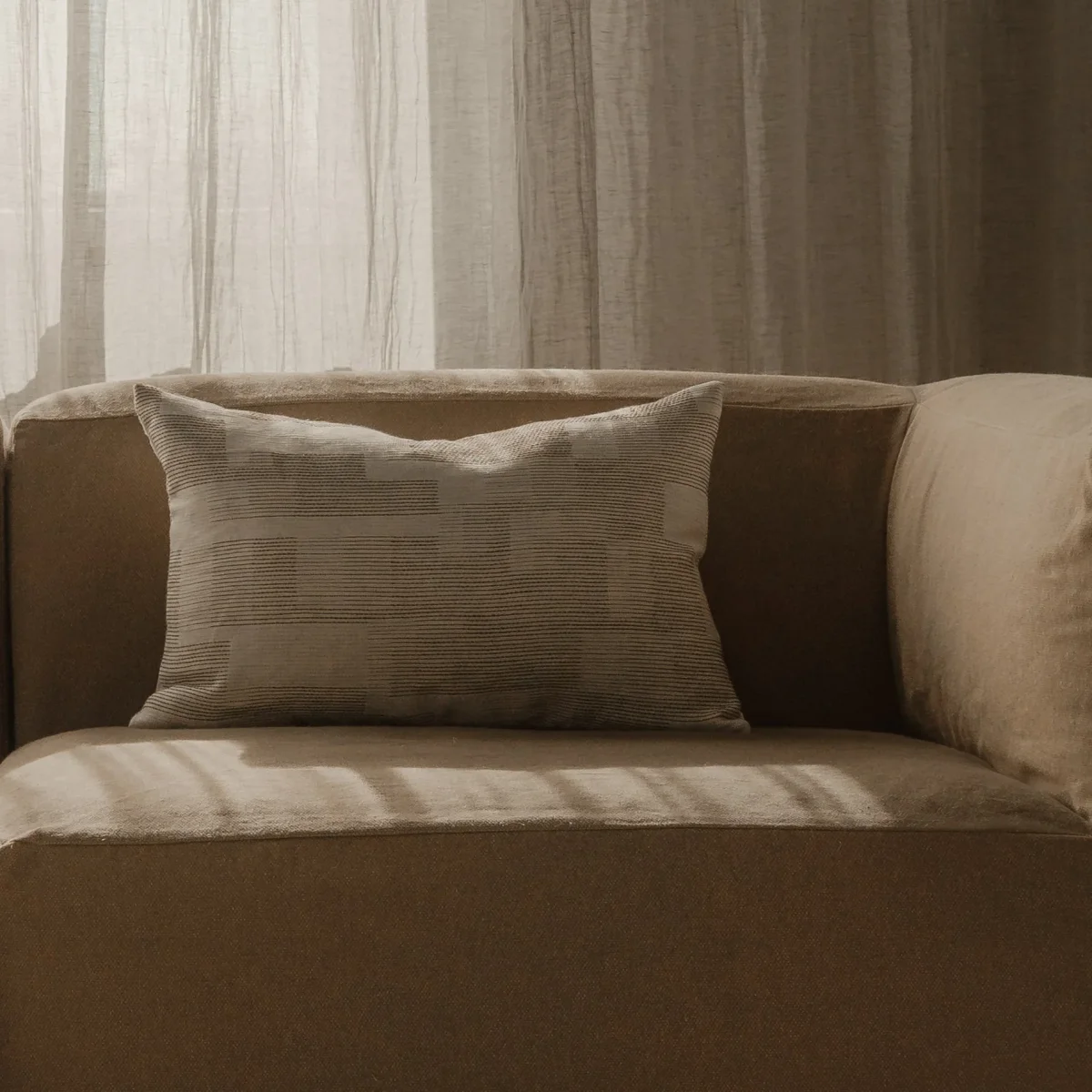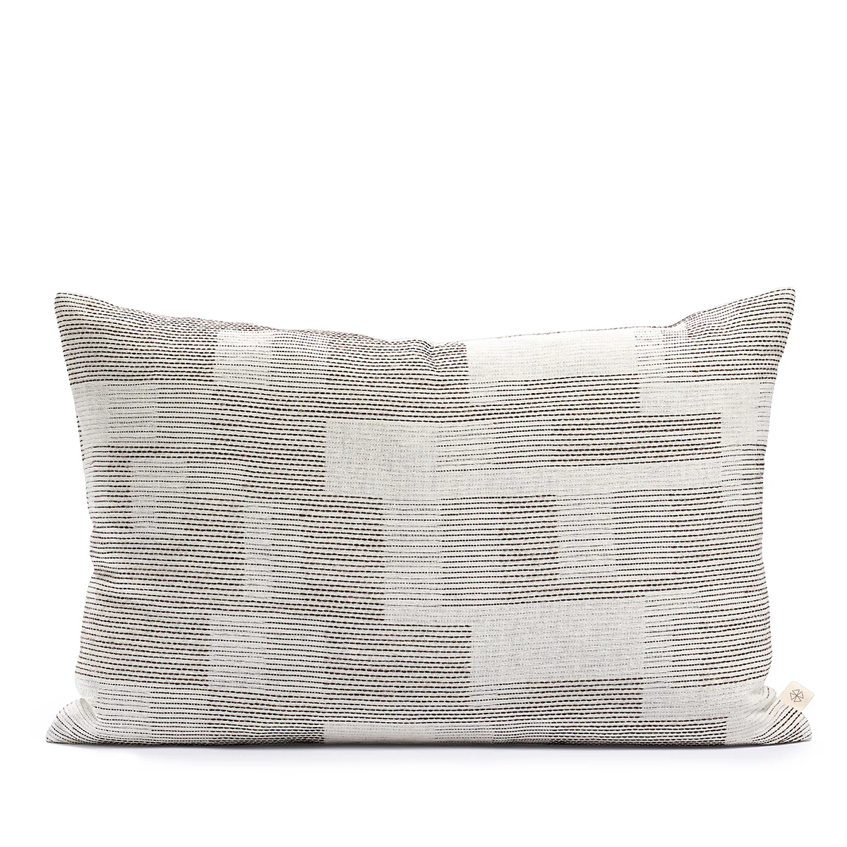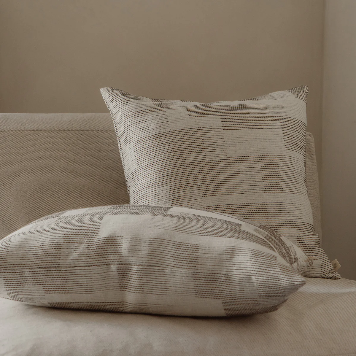 Add warmth and texture to your interior with this jaquard-woven cushion, crafted from pure Belgian linen and detailed with a wool Shashiko-inspired pattern in warm brown tones.