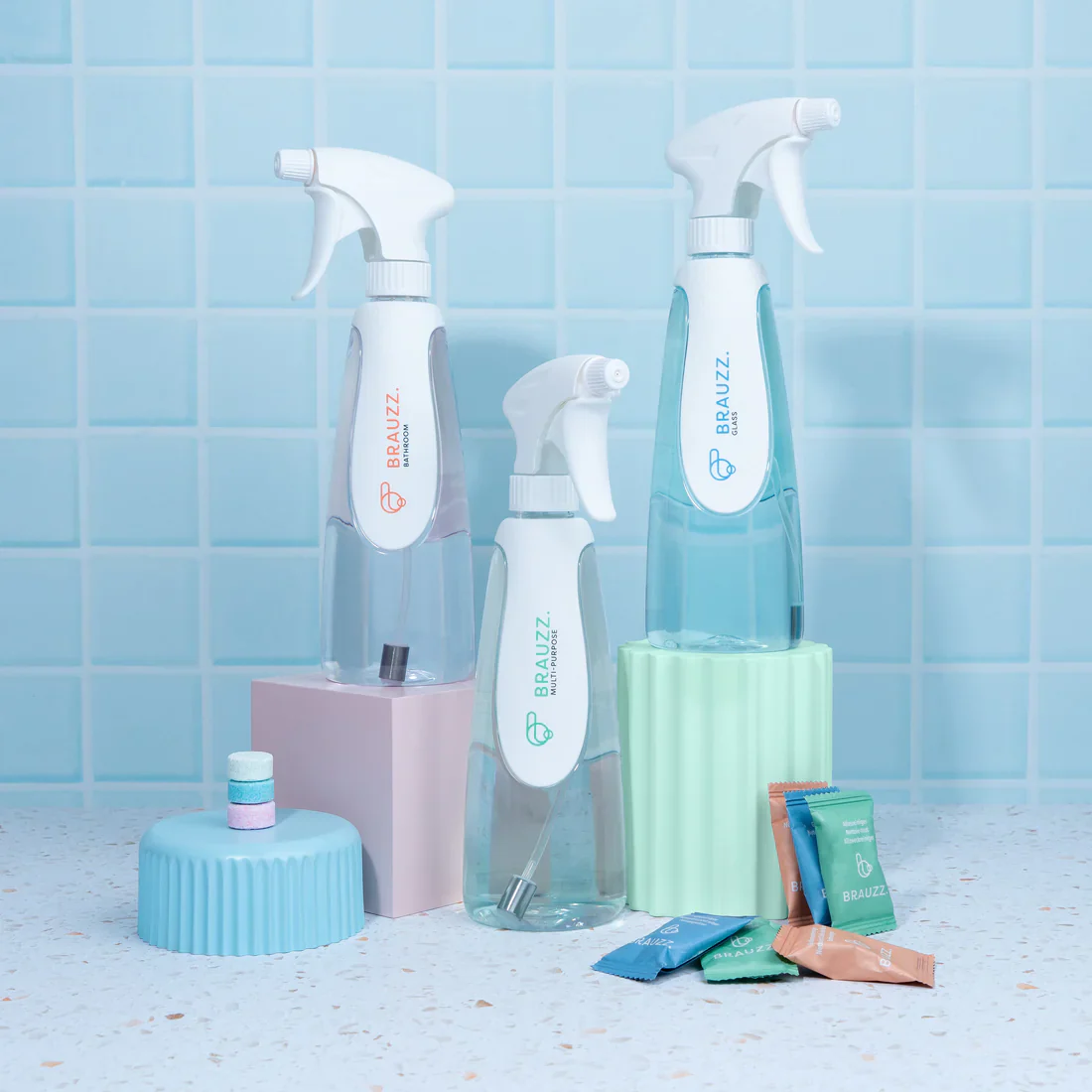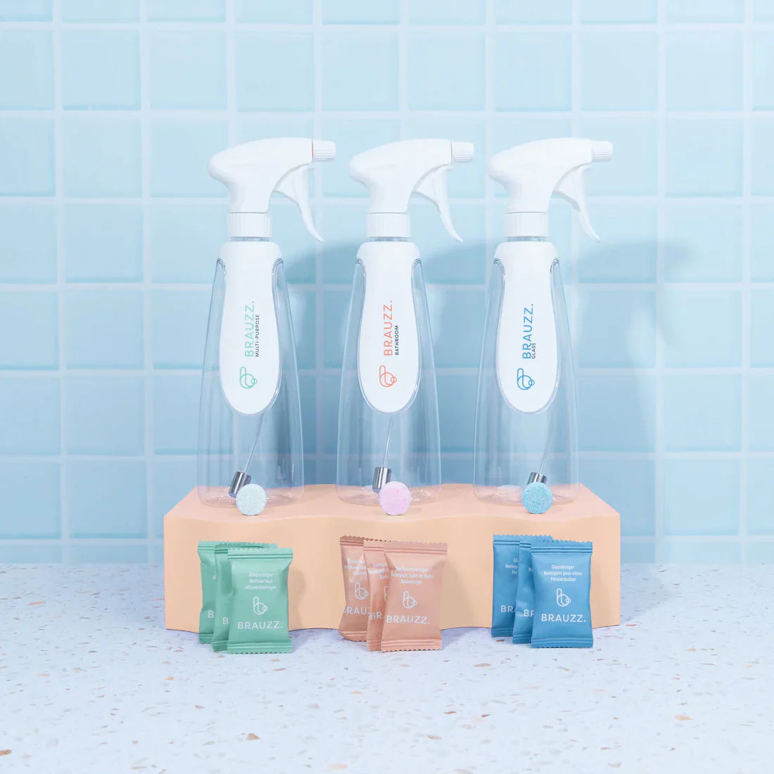 • Ingrediënten BRAUZZ. Badkamerreiniger: SODIUM CARBONATE, CITRIC ACID, DODECYLBENZENE SULFONIC ACID, PARFUM, COLORANT