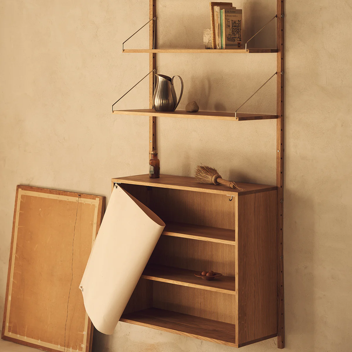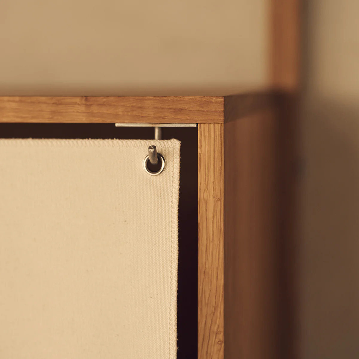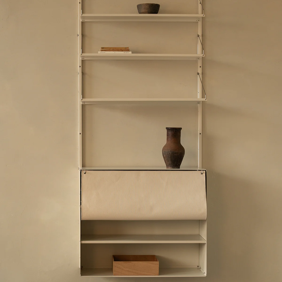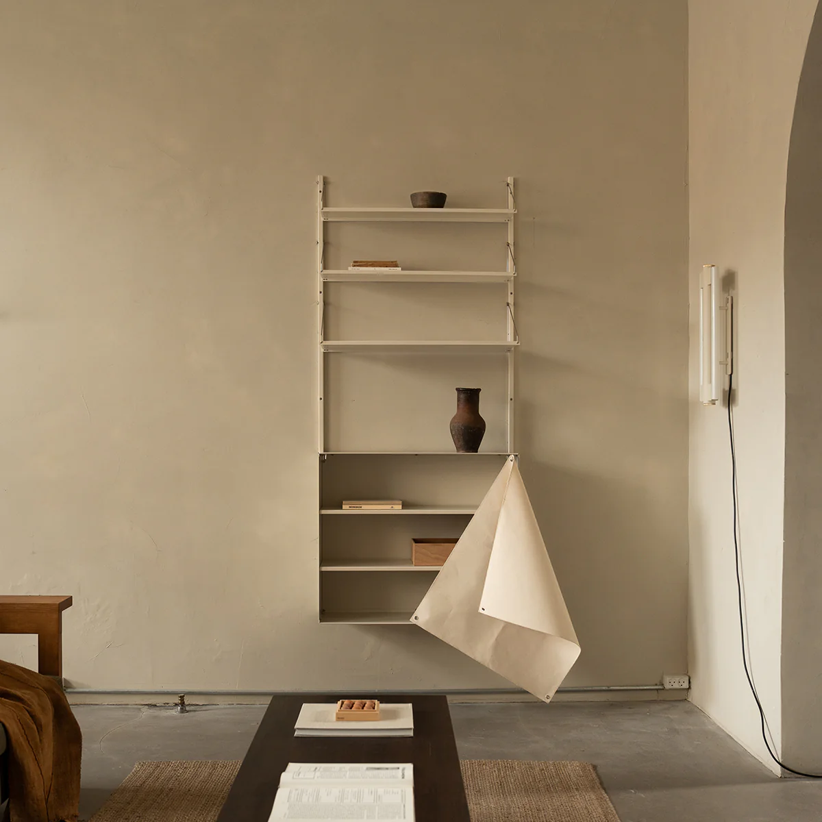 The Shelf Library Canvas Cabinet by Frama takes inspiration from the traditional Japanese “Noren”, a fabric divider hanging in doorways or windows often used to partition spaces and provide privacy. The heavy canvas fabric creates a clean, minimal look while providing a practical solution for hiding clutter and objects. Please get in touch if you are interested in different variants.