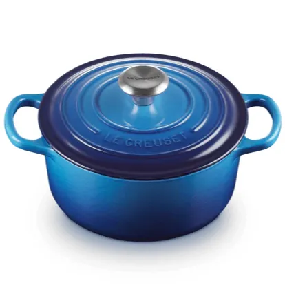 De Le Creuset Signature braadpan van 28 cm in Azure is een echte alleskunner met een royale inhoud van 6.7 liter. Ideaal voor grote gezinnen, etentjes of batch cooking. De pan combineert de klassieke kwaliteit van gietijzer met een moderne, heldere blauwe kleur voor een frisse en stijlvolle presentatie.
