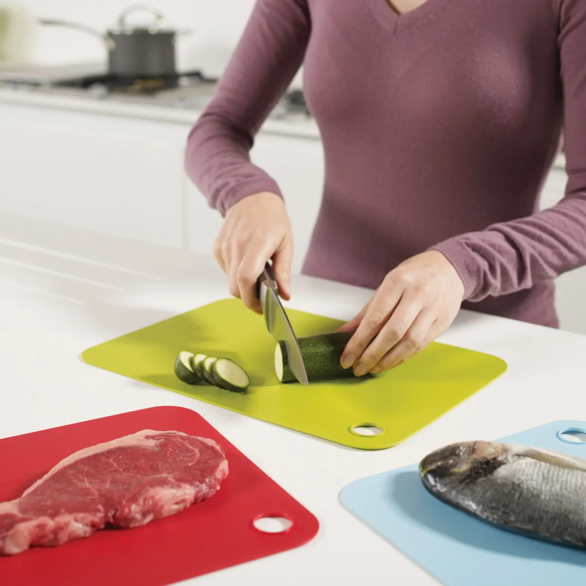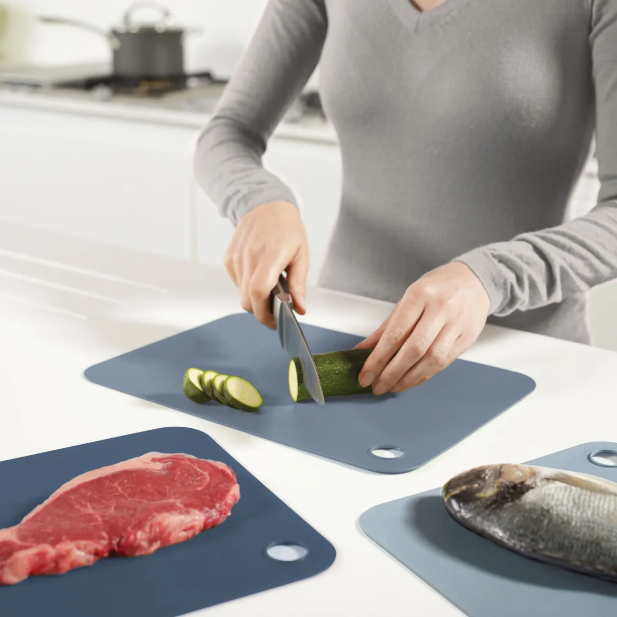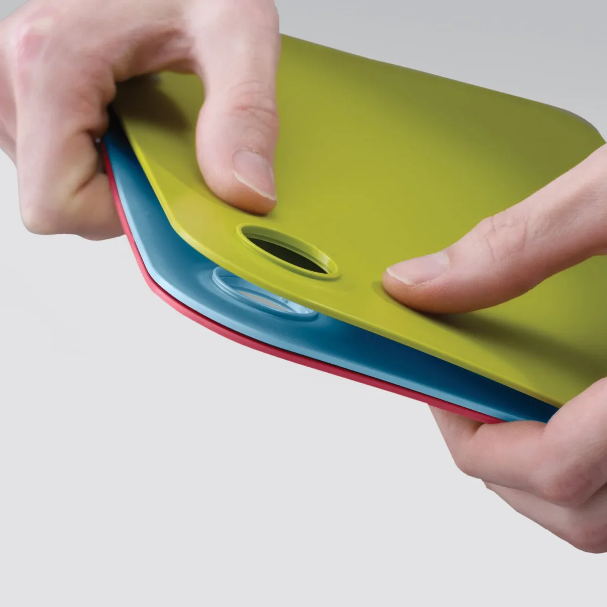 Maak het koken in je camper of caravan nog handiger met de set van 3 stuks Joseph Joseph snijplanken! Deze BPA-vrije kunststof snijplanken zijn ontworpen met uitsparing en klikbare rand, waardoor je de 3 planken netjes in elkaar kunt klikken voor ruimtebesparende opslag. Tevens kun je de uitsparing gebruiken om de set op te hangen. Ideaal voor keukens met beperkte opbergruimte.
