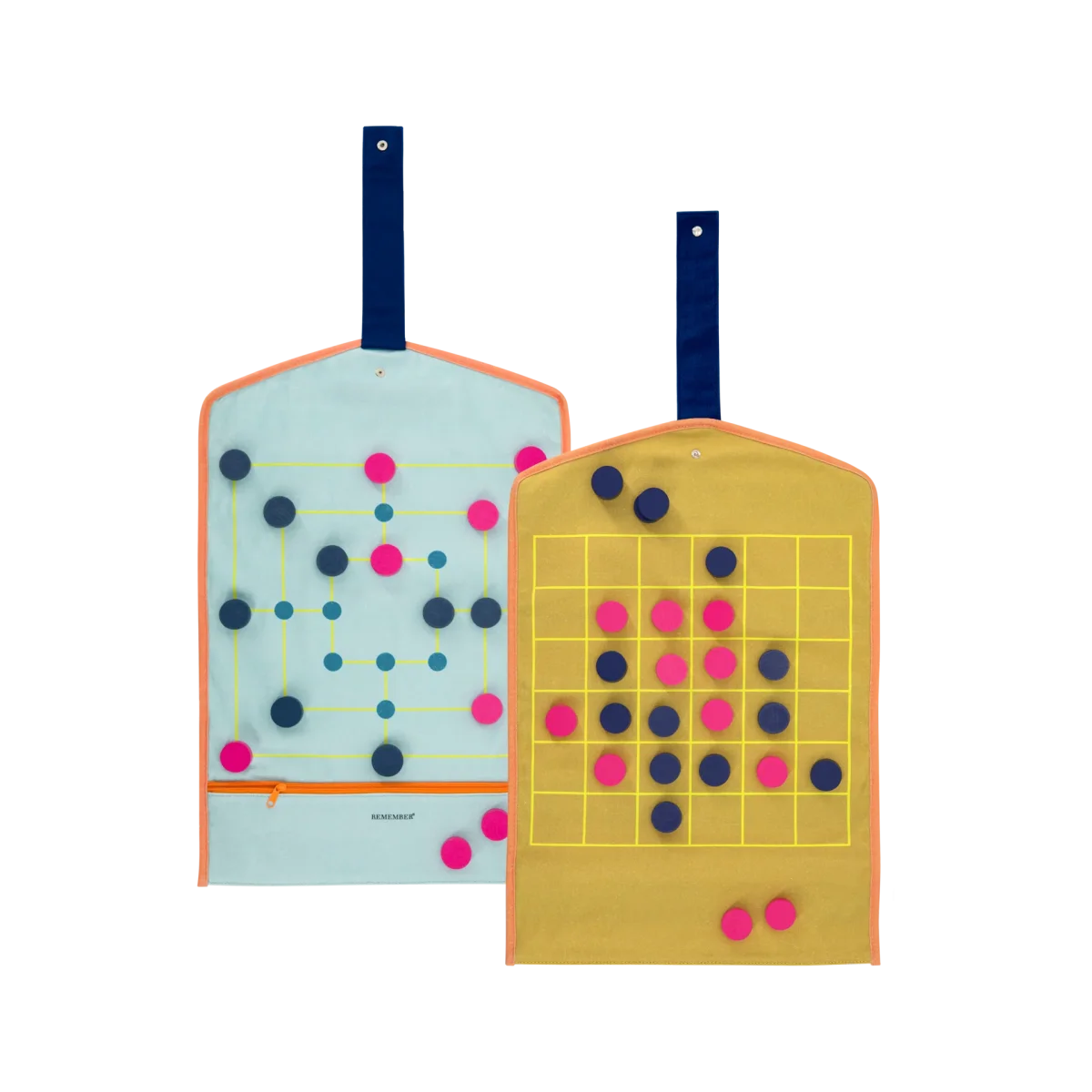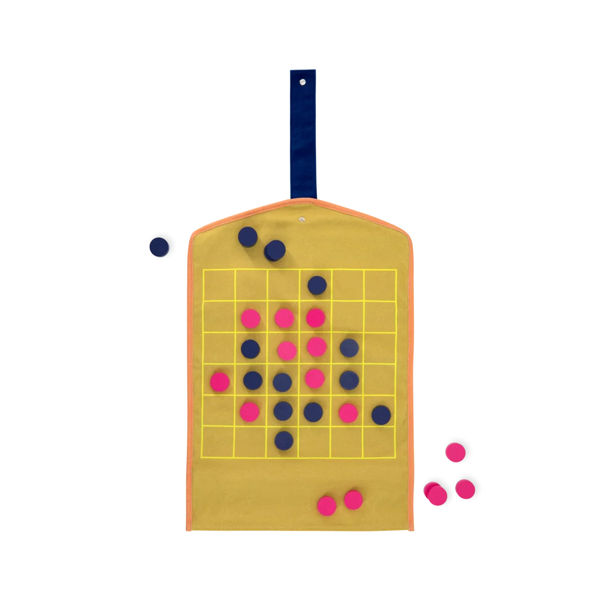 Zin in een spelletje voor onderweg? Het textielmolen/4 op een rij spel van katoen is ideaal voor lange autoritten, het park of het strand. Het spel rol je eenvoudig op voor transport en sluit je met een drukknoop. De kleurrijke spelstukken worden opgeborgen in een geïntegreerde tas.
