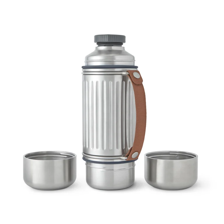 De thermosfles is uitgerust met een stevige nylon draagriem die het gemakkelijk maakt om de fles mee te nemen of in te schenken. De riem is eenvoudig te verwijderen wanneer je de fles wilt schoonmaken. De stalen dop heeft een handig schenksysteem dat morsen minimaliseert en ervoor zorgt dat je dranken goed warm blijven.