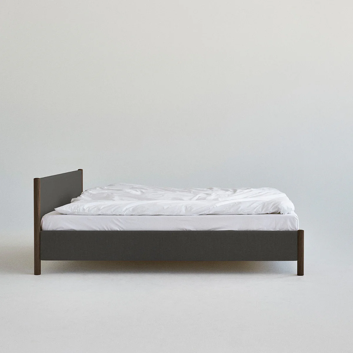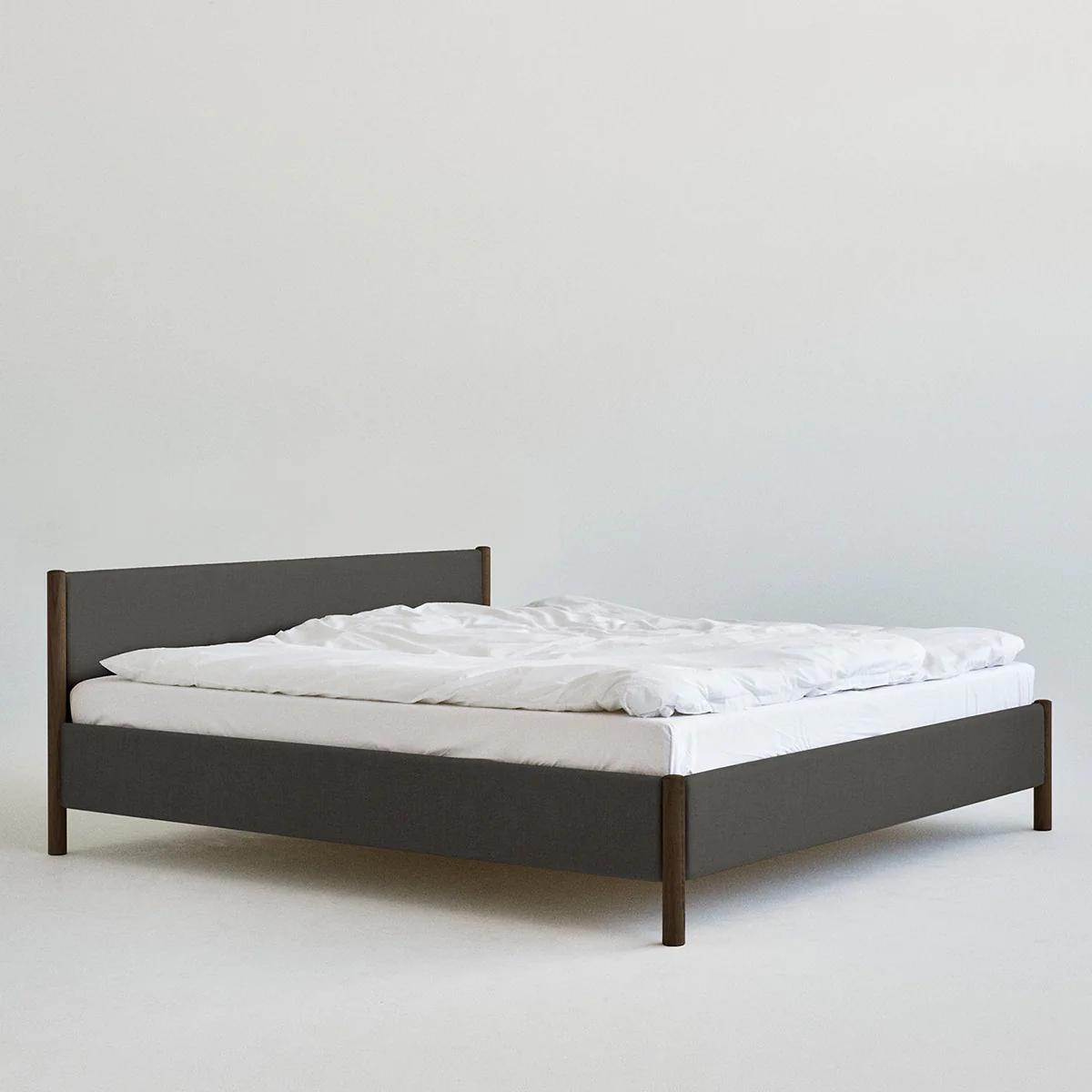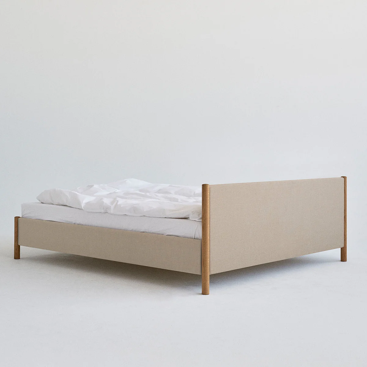 Designed by Oliver and Lukas WeissKrogh, the Veng Bed Frame presents a reimagination of the traditional upholstery bed. Outlined by a lower profile the bed frame features a linen textile, whose inviting tactility is complimented by bed posts of solid oak wood, subtly anchoring the framework.