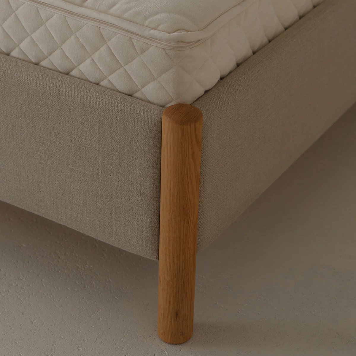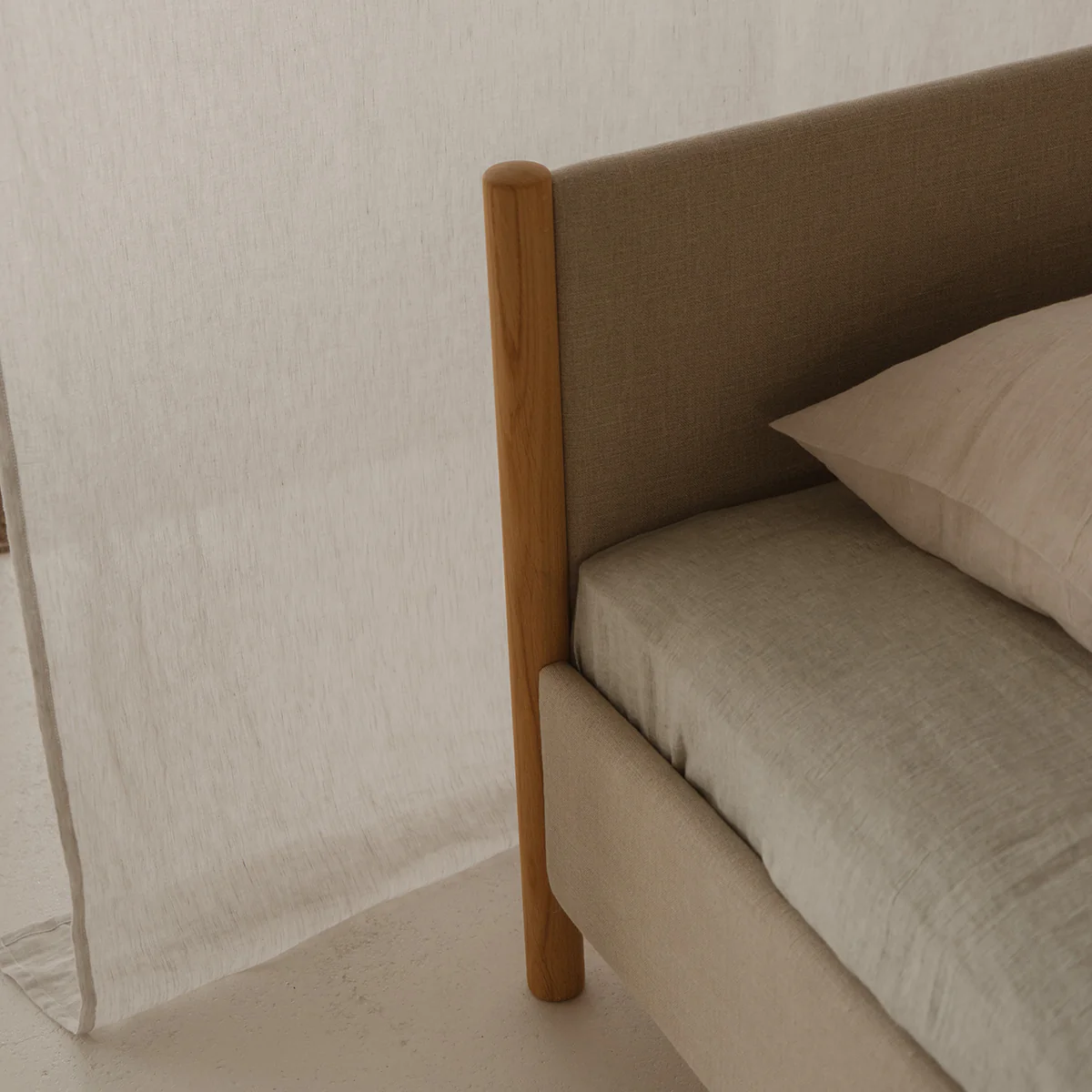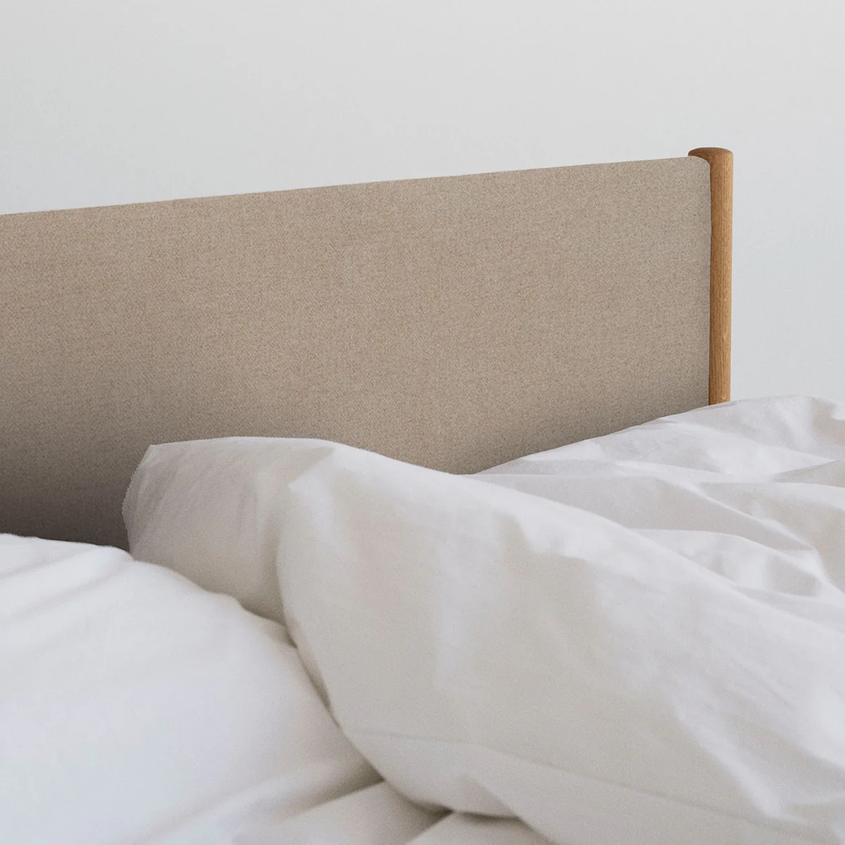 Designed by Oliver and Lukas WeissKrogh, the Veng Bed Frame presents a reimagination of the traditional upholstery bed. Outlined by a lower profile the bed frame features a linen textile, whose inviting tactility is complimented by bed posts of solid oak wood, subtly anchoring the framework.