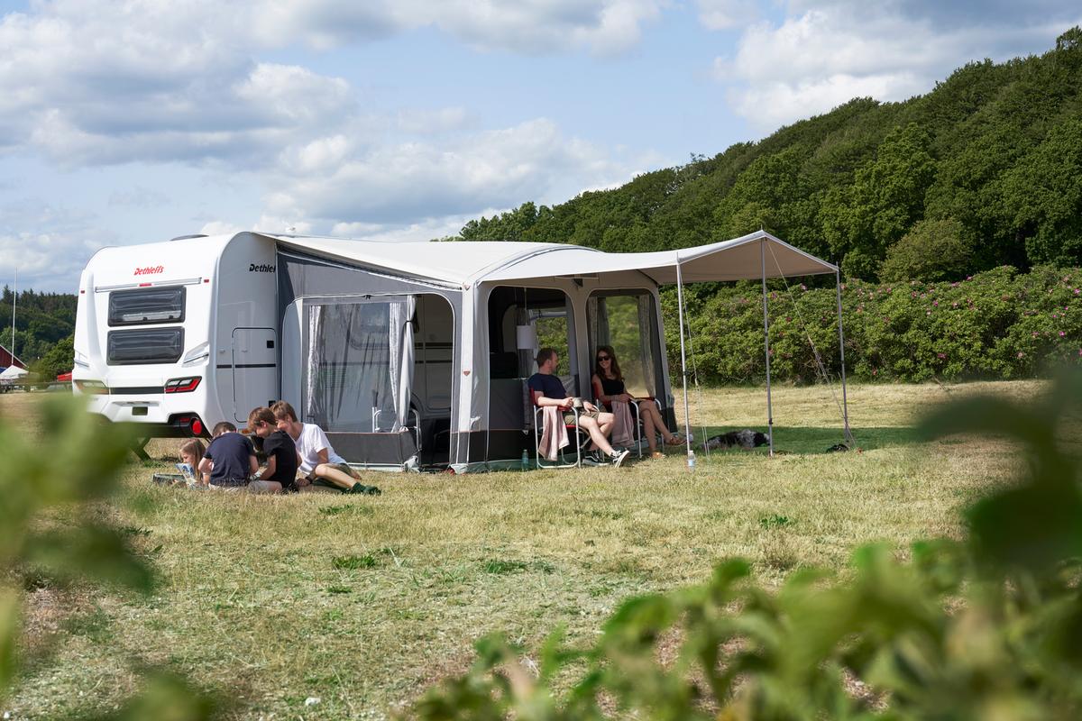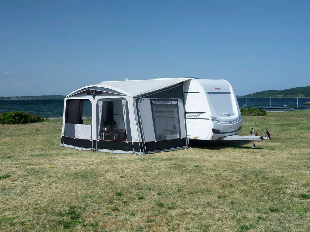 De Dove sluit mooi aan op de caravan dankzij een combinatie van schuimpad en zuignappen. Dit zorgt voor een nauwsluitende afdichting, zodat wind en regen minder kans krijgen om binnen te komen.