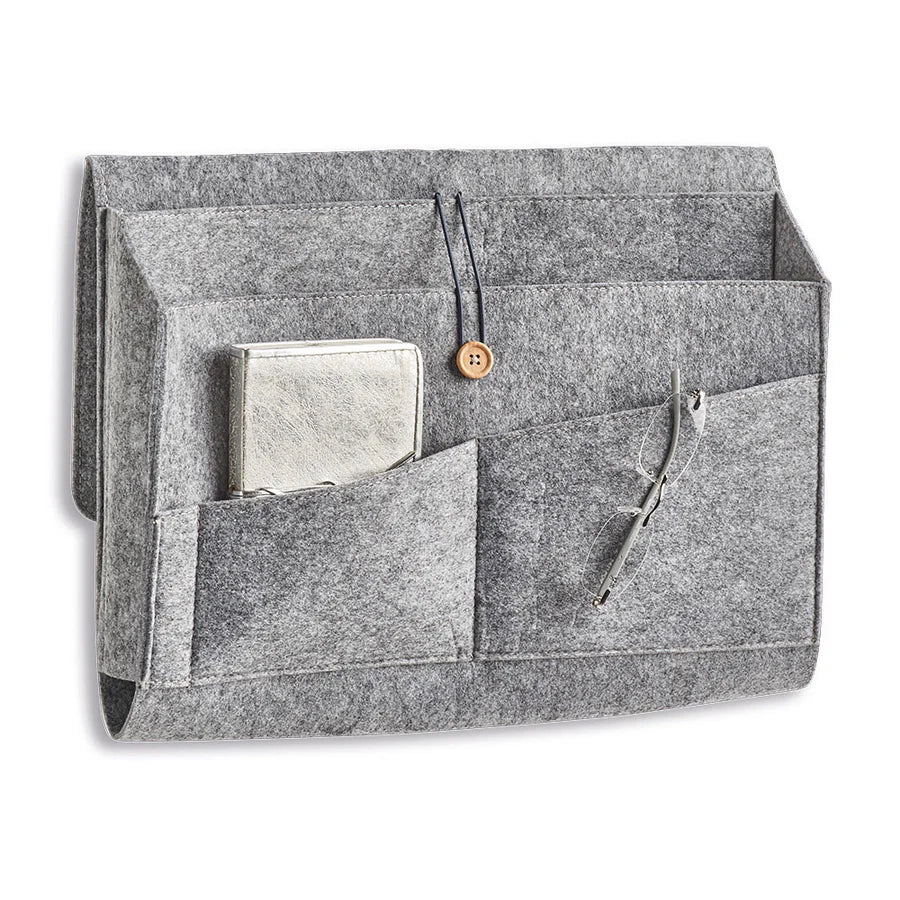 De organizer beschikt over meerdere vakken waarin je bijvoorbeeld je telefoon, afstandsbediening, boek, zakdoekjes of andere kleine spullen overzichtelijk kunt opbergen. Het grote vak sluit met een houten knop, zodat je spullen veilig en netjes opgeborgen blijven.