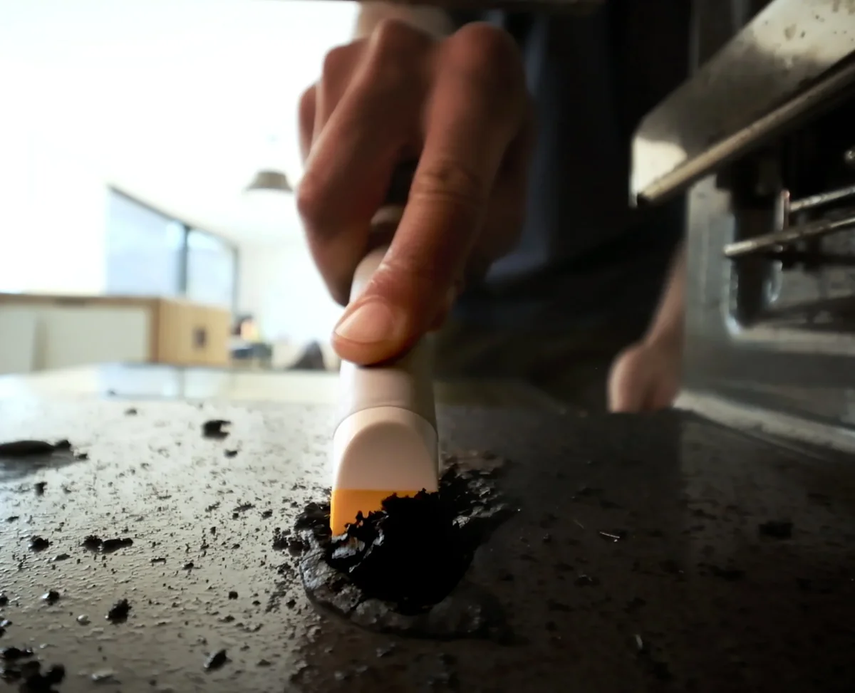 Een ingebouwde schraper aan de steelpunt om kalkaanslag en hardnekkig vuil aan te pakken