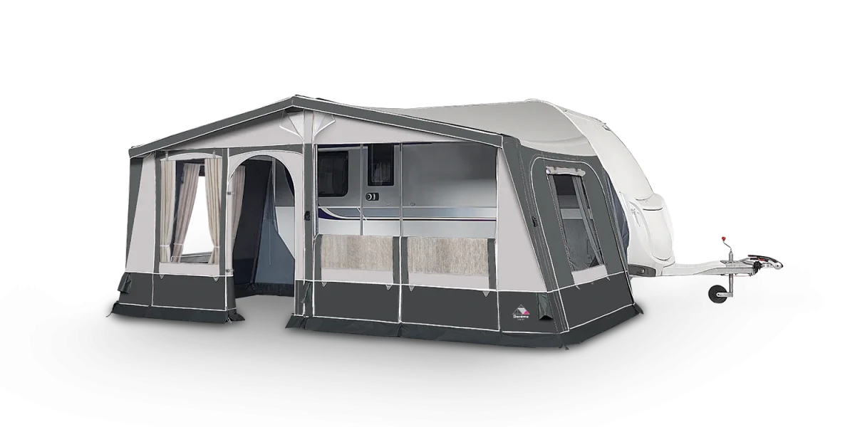 De Horizon Air De Luxe is voorzien van uitritsbare en neerrolbare voor- en zijpanelen, zodat je de voortent eenvoudig kunt aanpassen aan de weersomstandigheden. Alle ramen zijn uitgerust met raamkleppen aan de buitenzijde, wat zorgt voor extra bescherming tegen zonlicht en inkijk. Dubbele slikranden en afgedekte ritsen zorgen voor een perfecte afdichting en extra duurzaamheid.