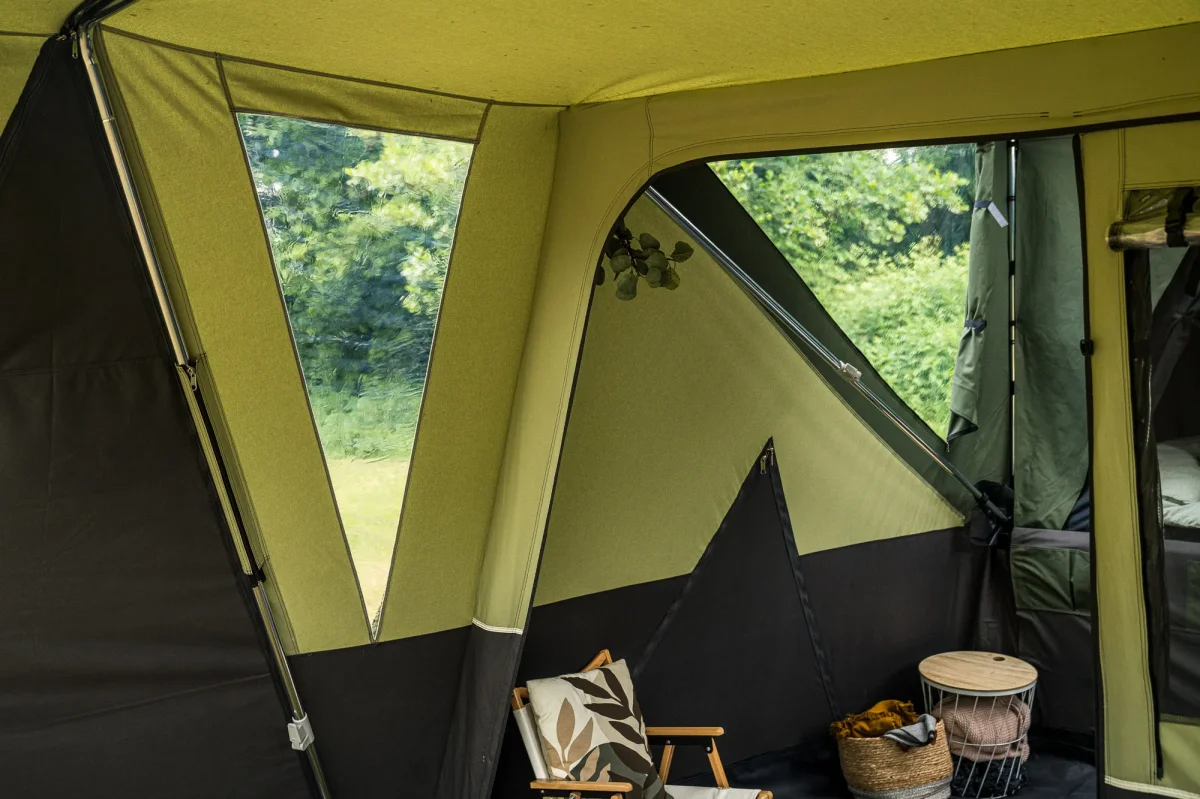 Slapen onder tentdoek is misschien wel een van de fijnste dingen van kamperen. Het ademende katoen zorgt voor een heerlijk binnenklimaat. De lattenbodem is voorzien van een nieuw U-profiel met daarop een comfortabel 8 cm dik schuimmatras. Zo lig je prinsheerlijk op een stevige bodem.