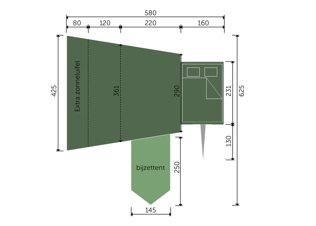 Afmetingen: Woongedeelte van 220 x 290/361 cm, standaard voorzien van een luifel (120 cm) en uit te breiden met extra luifel (80 cm)