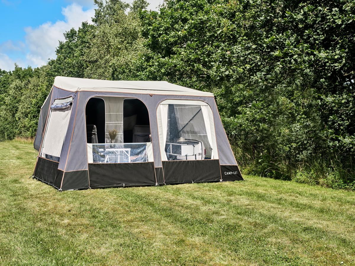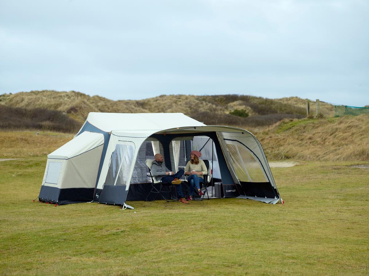 De twee voorpanelen en de linker zijkant kunnen goed worden uitgeritst, zodat je de Camp-let North kunt omtoveren tot een grote luifel. Eén van de voorpanelen kan naar de zijkant worden gerold om een deuropening te maken. Er wordt een veranda stang meegeleverd zodat je een van de voorpanelen of de linkerkant naar beneden kunt klappen voor een veranda.