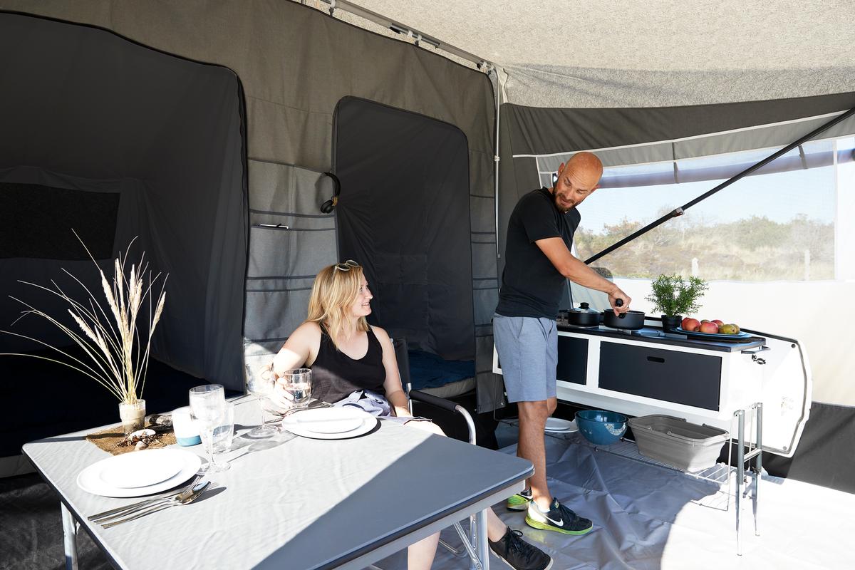 Het duurt slechts 15 minuten om een Camp-let North op te zetten. De Camp-let vouwwagen is niet alleen gemakkelijk mee te nemen voor onderweg, maar ook snel en gemakkelijk op te zetten. De leef en slaapcabines zijn gemakkelijk in één handeling op te zetten.