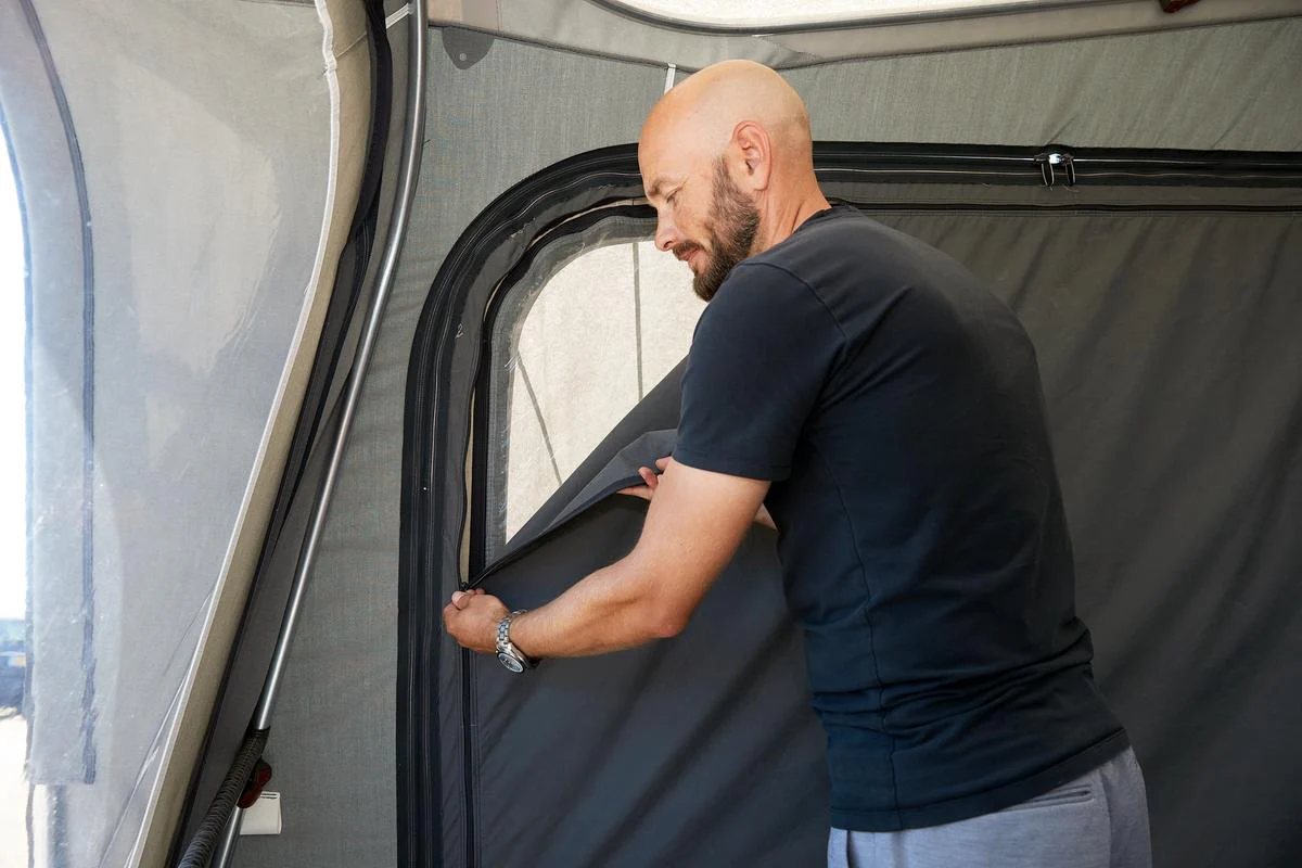 De Camp-let Passion heeft een praktische luifel om te voorkomen dat vuil en afval langs de ramen naar beneden lopen. De voor- en zijkanten kunnen goed worden uitgeritst, waardoor de Camp-let Passion kan worden omgetoverd tot een grote luifel.
