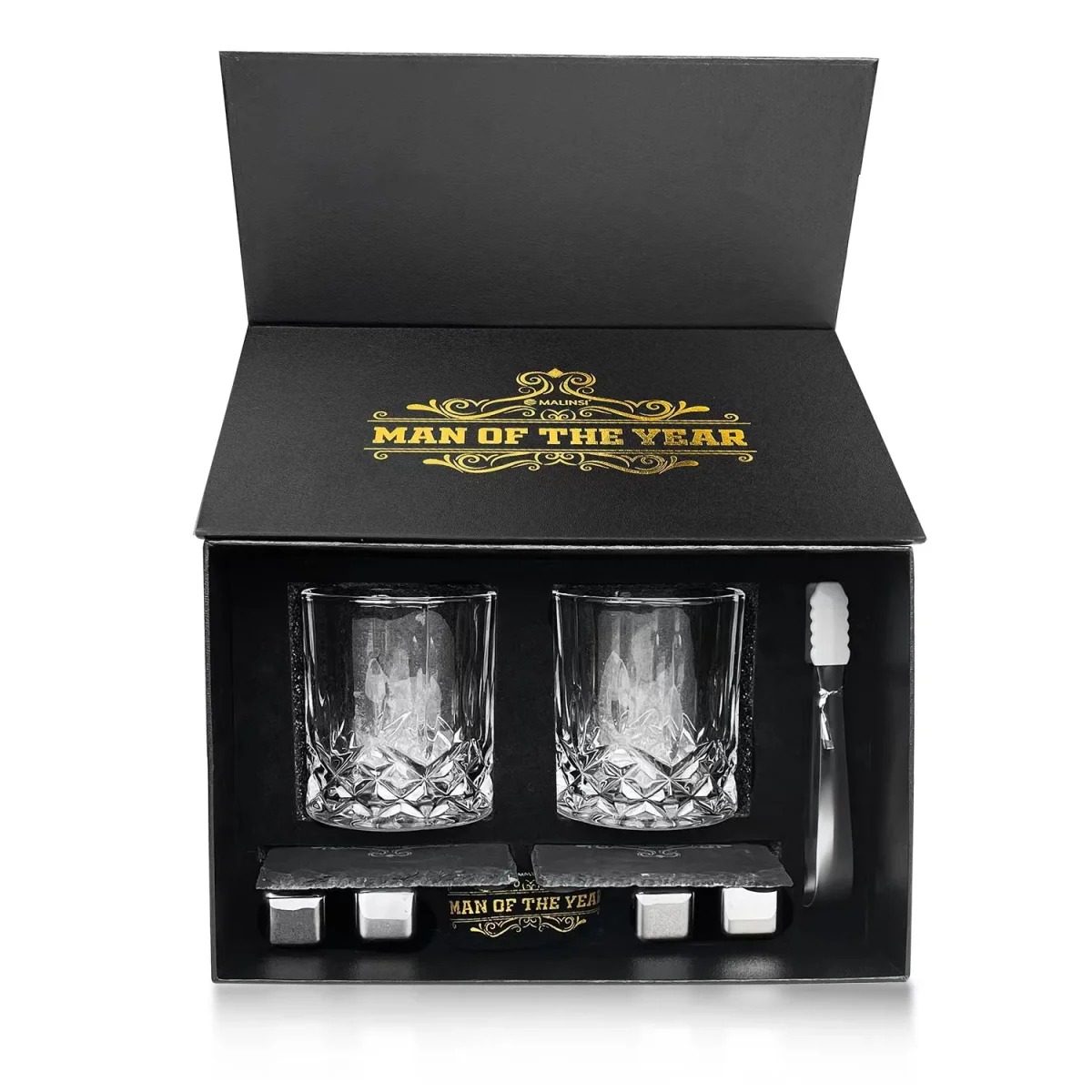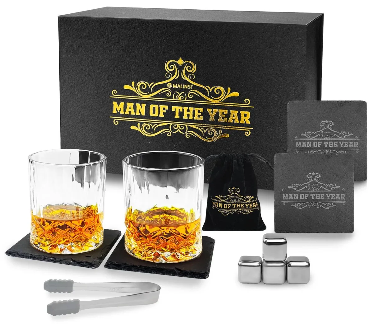 Geef hem dan nu het ideale cadeau met deze prachtige Malinsi whiskeyglazen set. Door het mooie design op de verpakking laat jij aan hem weten dat hij de “man of the year” is. De mooie verpakking heeft niet alleen een speciaal design maar is ook magnetisch waardoor jij je glazen ook altijd netjes kan opbergen in de speciale verpakking. In deze set zitten twee zeer sterke tumbler whiskey glazen die het ideale geschenk zijn voor elke liefhebber. Daarnaast zitten er in deze set ook 2 stenen onderzetters, 4 metalen ijsblokjes met opbergzakje en ijsblokjes tang zodat jou whiskeyavond helemaal compleet zal zijn. Het klassieke design in de glazen zorgt niet alleen voor een comfortabele grip maar ook voor een echte gentleman look. De glazen zijn gemaakt van sterk en vaatwasserbestendig glas zodat ze ook zeer lang mee zullen gaan. Door het formaat van 310ml zijn ze niet alleen geschikt voor whiskey maar ook verschillend cocktails en andere drankjes. Verras nu jou man van het jaar met deze prachtige Malinsi whiskeyglazen set!