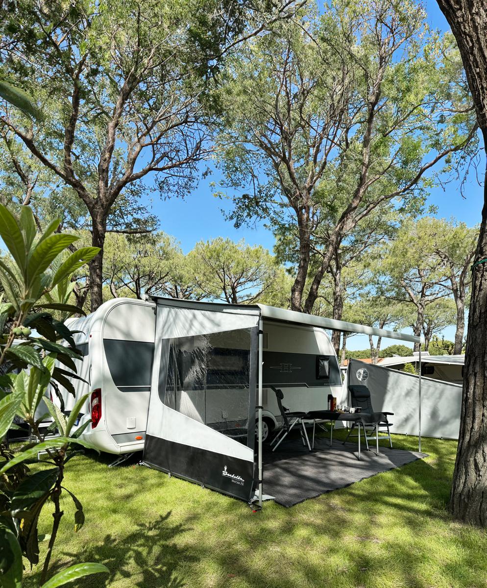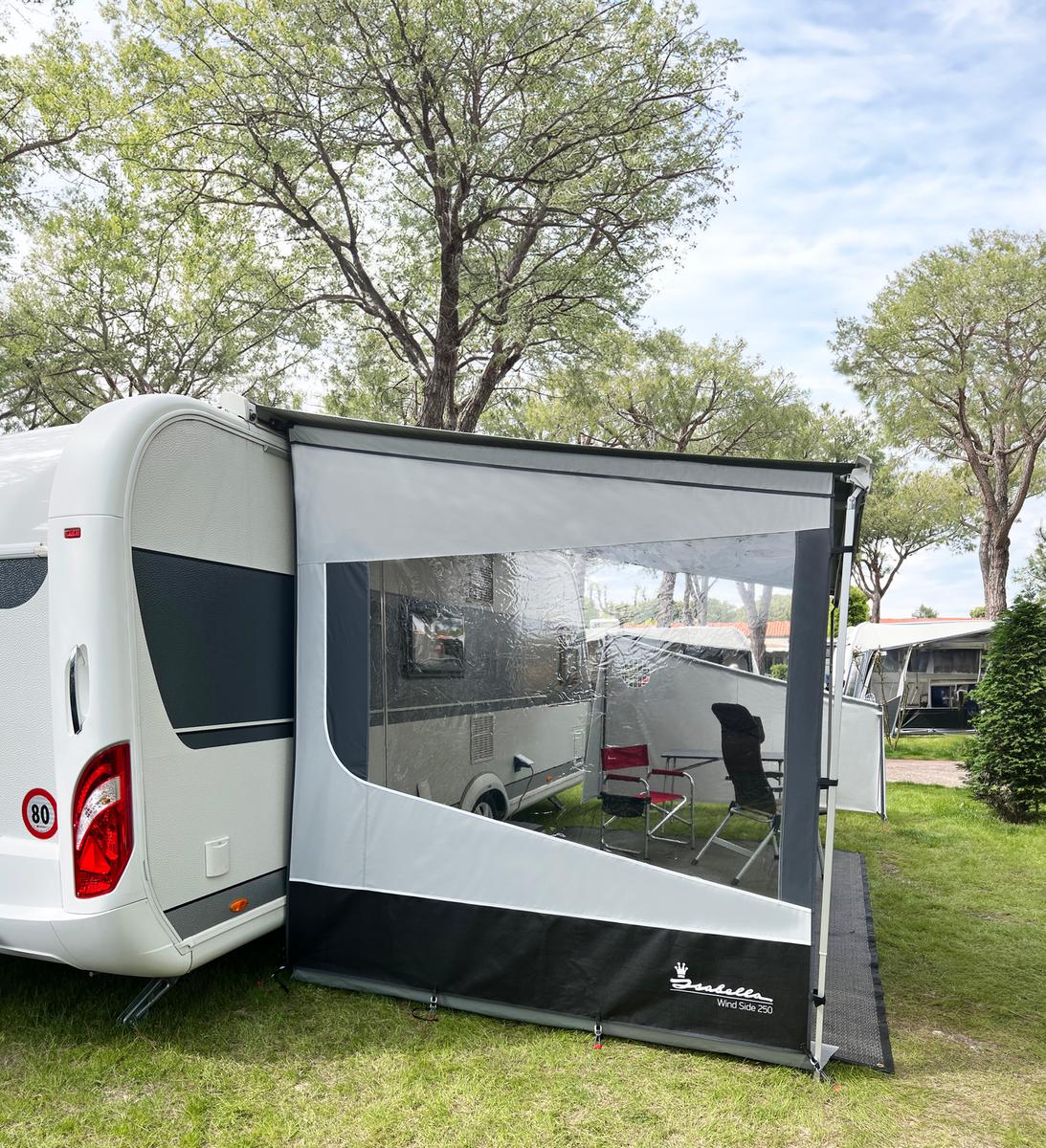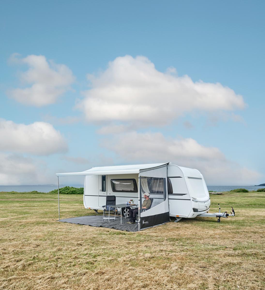 Dankzij het grote, heldere raam geniet je van veel daglicht, terwijl je toch lekker uit de wind zit. Met drie zuignappen wordt het zijpaneel stevig tegen de caravan of het voertuig bevestigd – ideaal om tocht te verminderen en alles netjes op zijn plek te houden.
