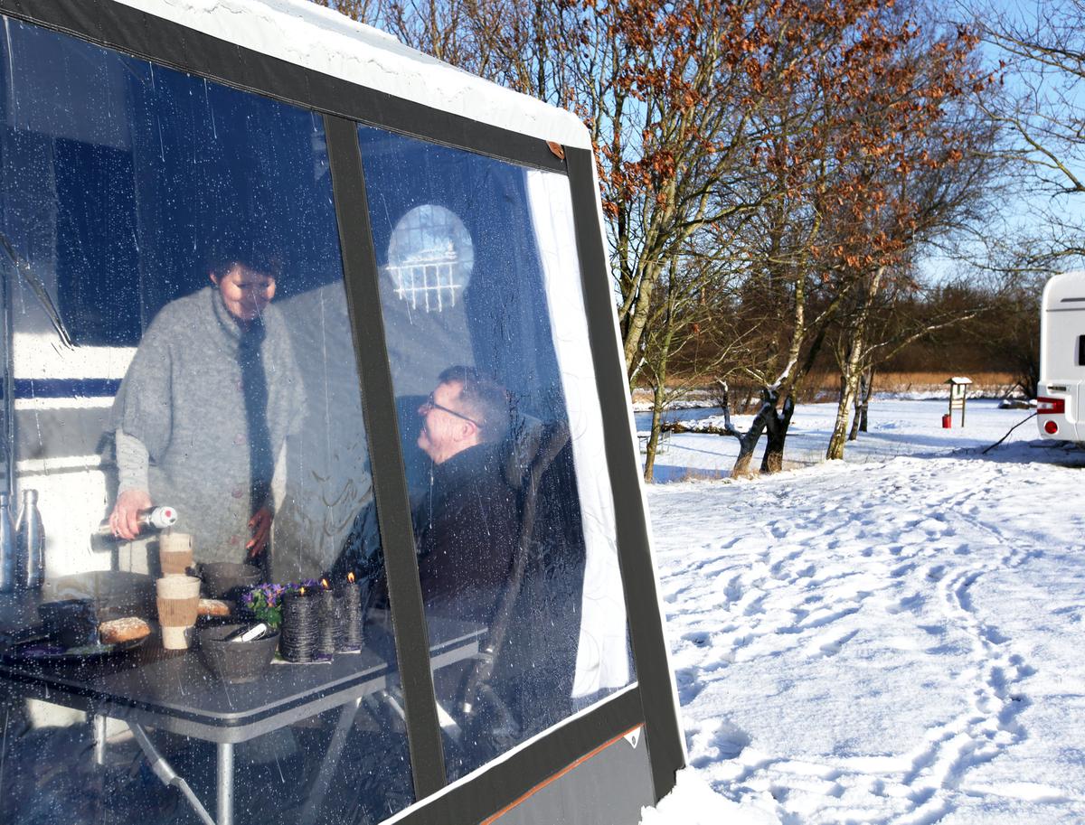Combineer je dit met een flexibele afspanning en vensterfolie die bestand is tegen extreme vorst, dan is deze wintervoortent zelfs klaar voor écht stevig weer — tot en met een flinke sneeuwstorm. Een betrouwbare, stabiele voortent waarmee je ook in de winter heerlijk van het caravannen geniet.