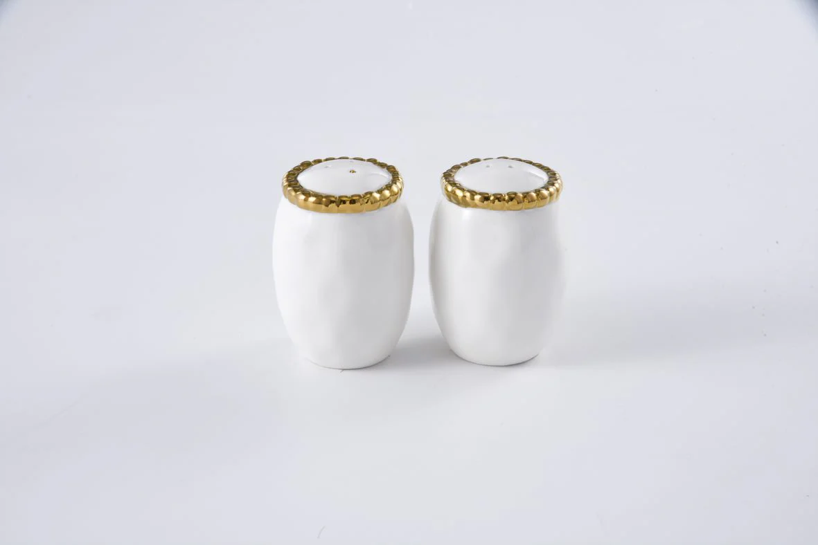 Zout- en peperschudders in Golden Salerno Collection. Prachtig tafelaccessoire zodat vrienden en familie hun eten op smaak kunnen brengen zoals ze willen. Deze shakers worden geleverd in een strakke Pampa Bay-doos, gemakkelijk in te pakken voor het perfecte housewarming cadeau! Prachtig wit porselein met gouden kralenrand.